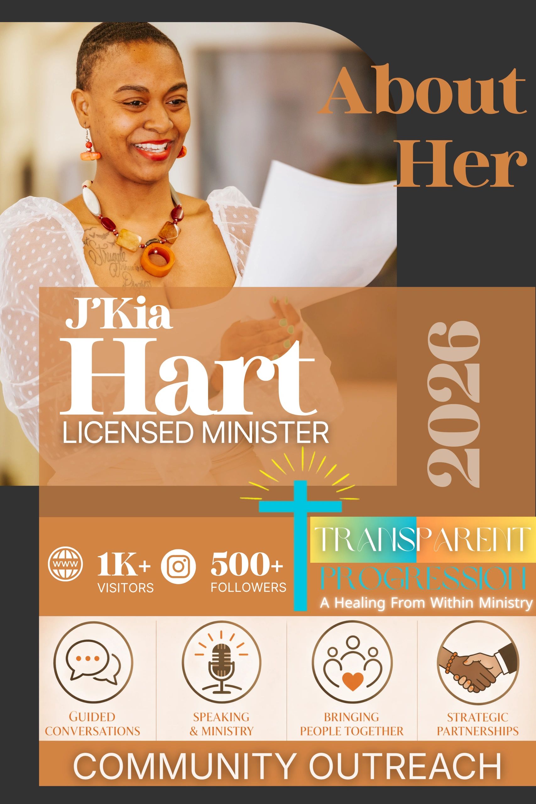 In 2018 J'kia founded Transparent Progression, a trauma-informed ministry, providing social services through community outreach.